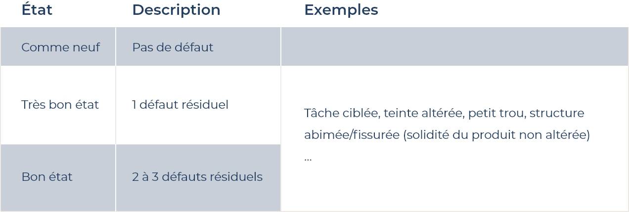 Découvrez en fiche produit, si le produit « seconde chance » est « Comme neuf », en « Très bon état » ou en « Bon état ». Retrouvez le détail de ces états dans le tableau.