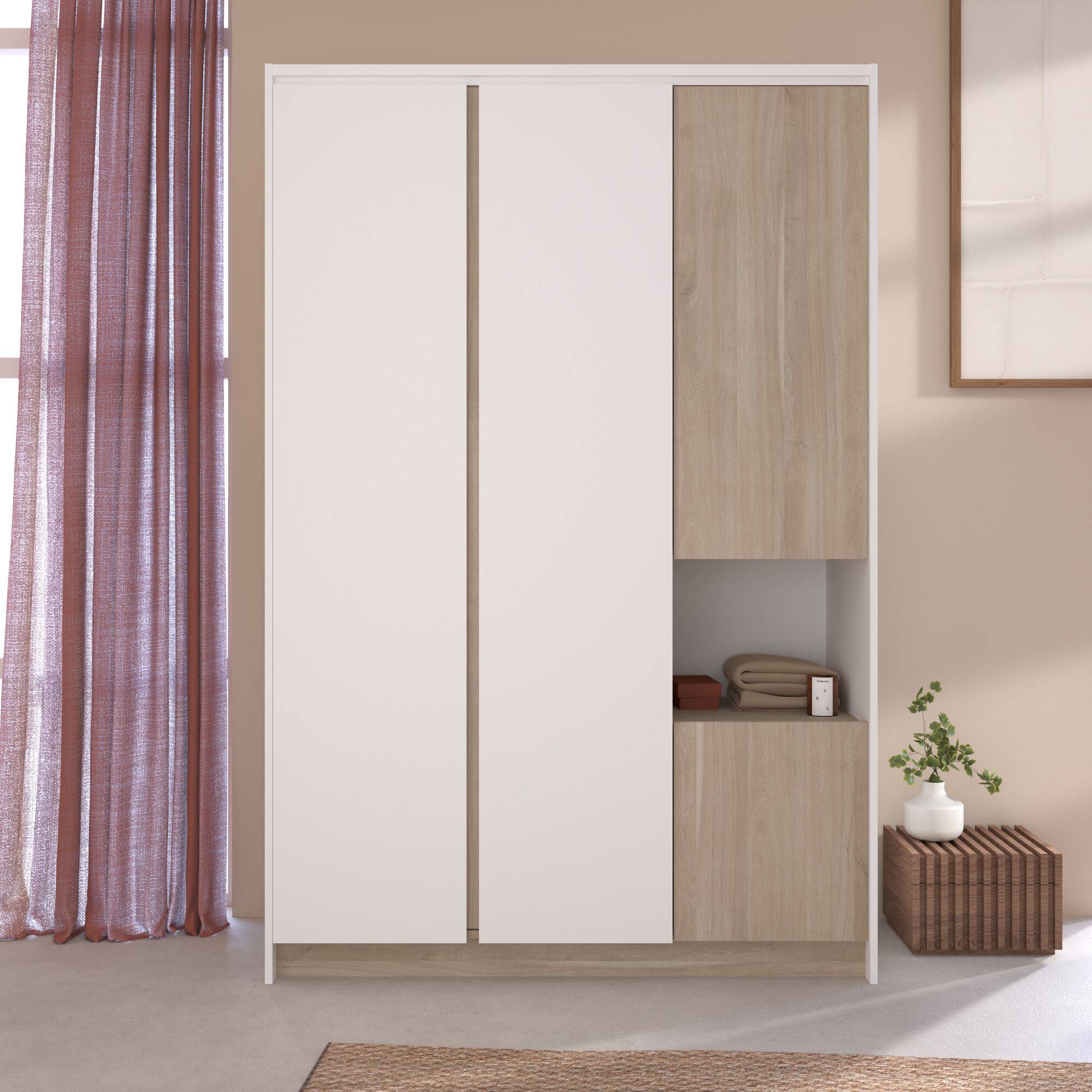 Laissez vous séduire par l'armoire 4 portes avec sa niche de rangement, l'alliance parfaite entre élégance et fonctionnalité pour votre chambre !