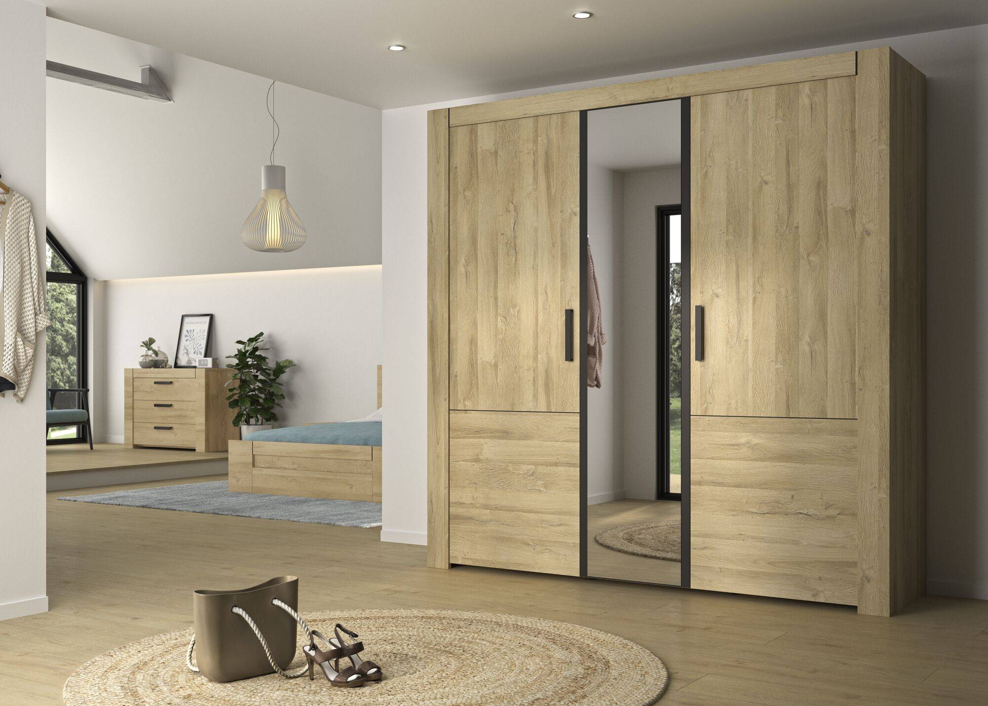 Cette armoire est à la fois fonctionnelle et élégante. Son décor bois est réhaussé par des poignées métal et le détail noir de chaque côté du miroir, apportant la touche moderne et design de votre chambre.