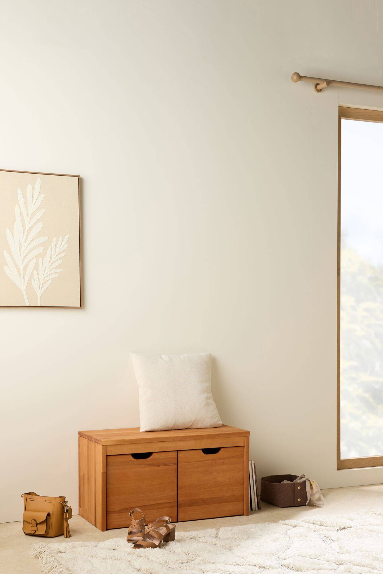 Sous son assise, le banc Cyriel accueille 2 cubes de rangement équipés de petites roulettes, parfaits pour organiser vos chaussures, livres ou autres objets du quotidien tout en gardant un espace ordonné. Grâce à sa conception compacte, il trouve facilement sa place dans des pièces plus réduites, tout en offrant une solution de rangement élégante et efficace.