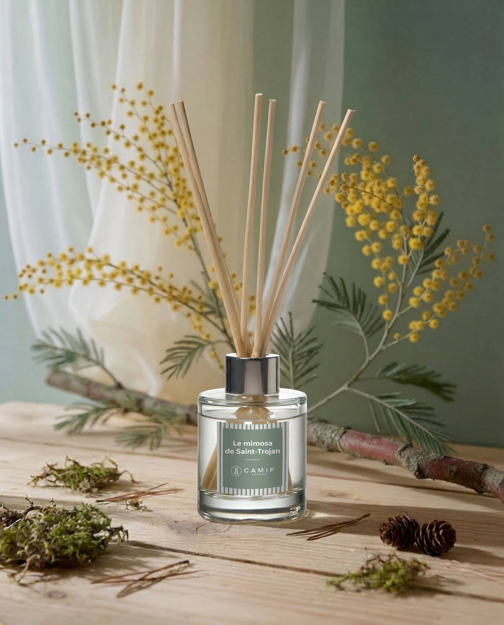 Laissez-vous transporter par le Bouquet Senteur Le Mimosa de Saint-Trojan qui capture l'essence solaire de la "fleur bavarde" pour illuminer votre intérieur par capillarité.