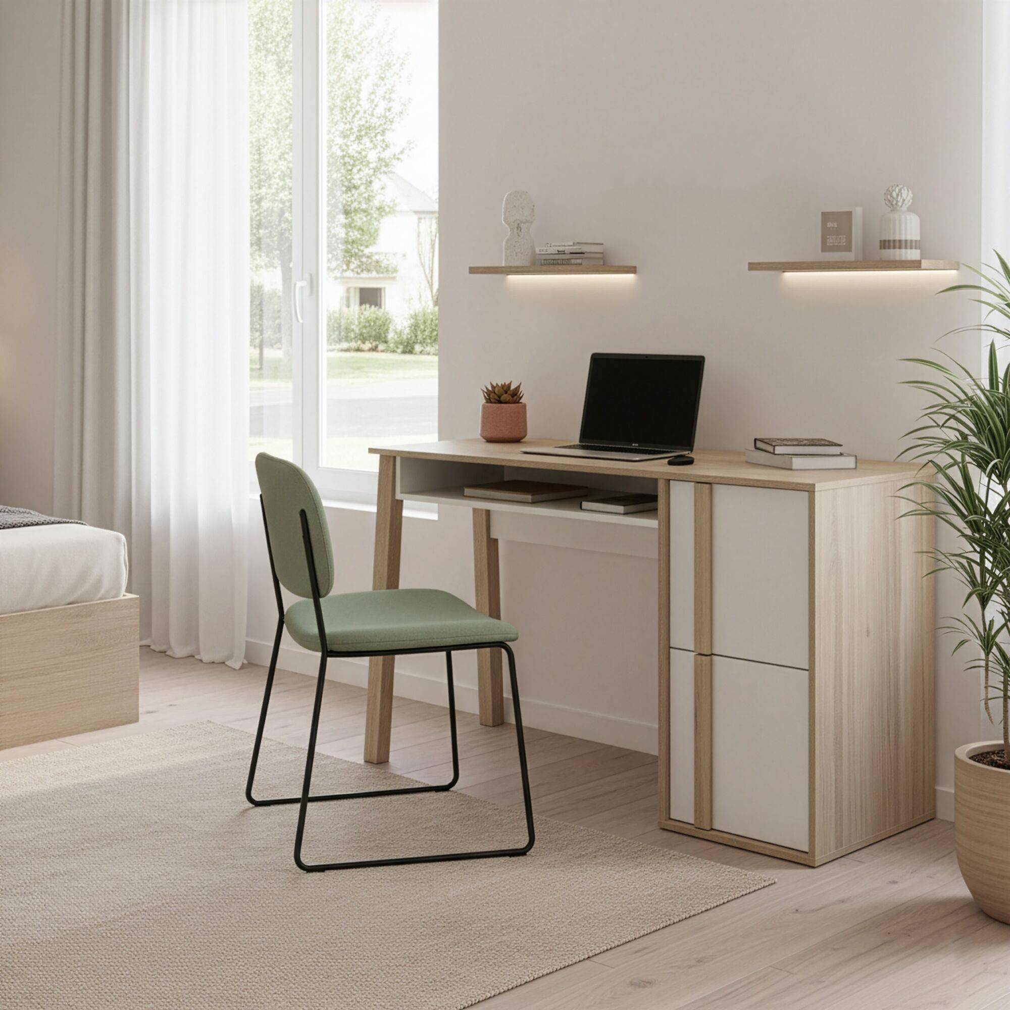 Le bureau Gabrielle capte le regard avec son allure scandinave, soulignée par un piétement incliné original et un équilibre subtil entre son ossature bois clair et ses portes blanc.