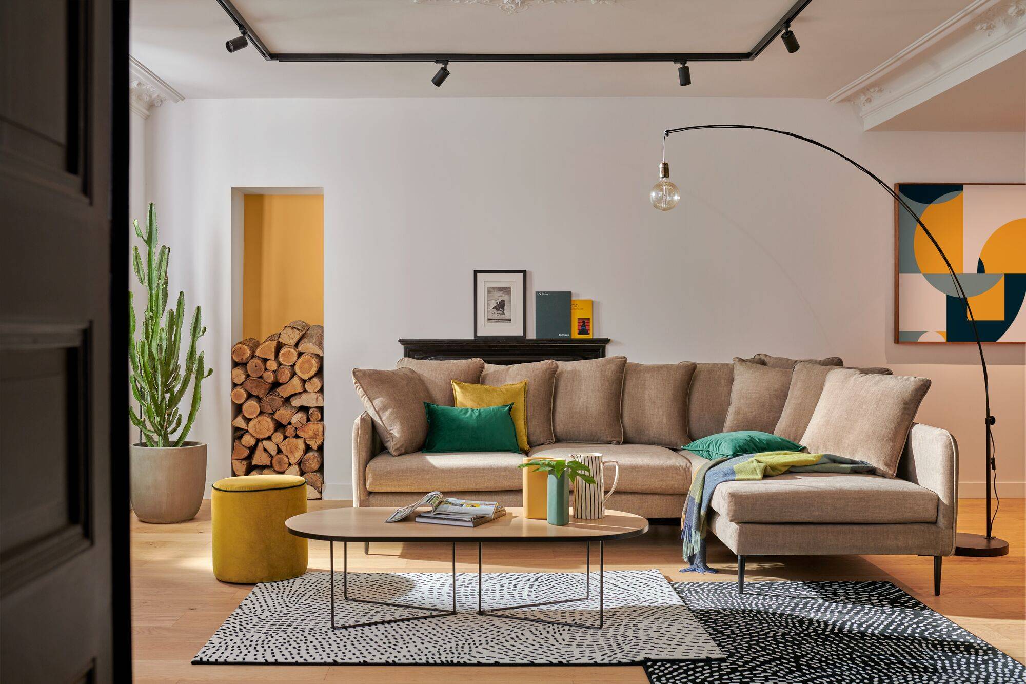 Le canapé d'angle velours Olympe séduit par ses lignes épurées et son élégante simplicité.