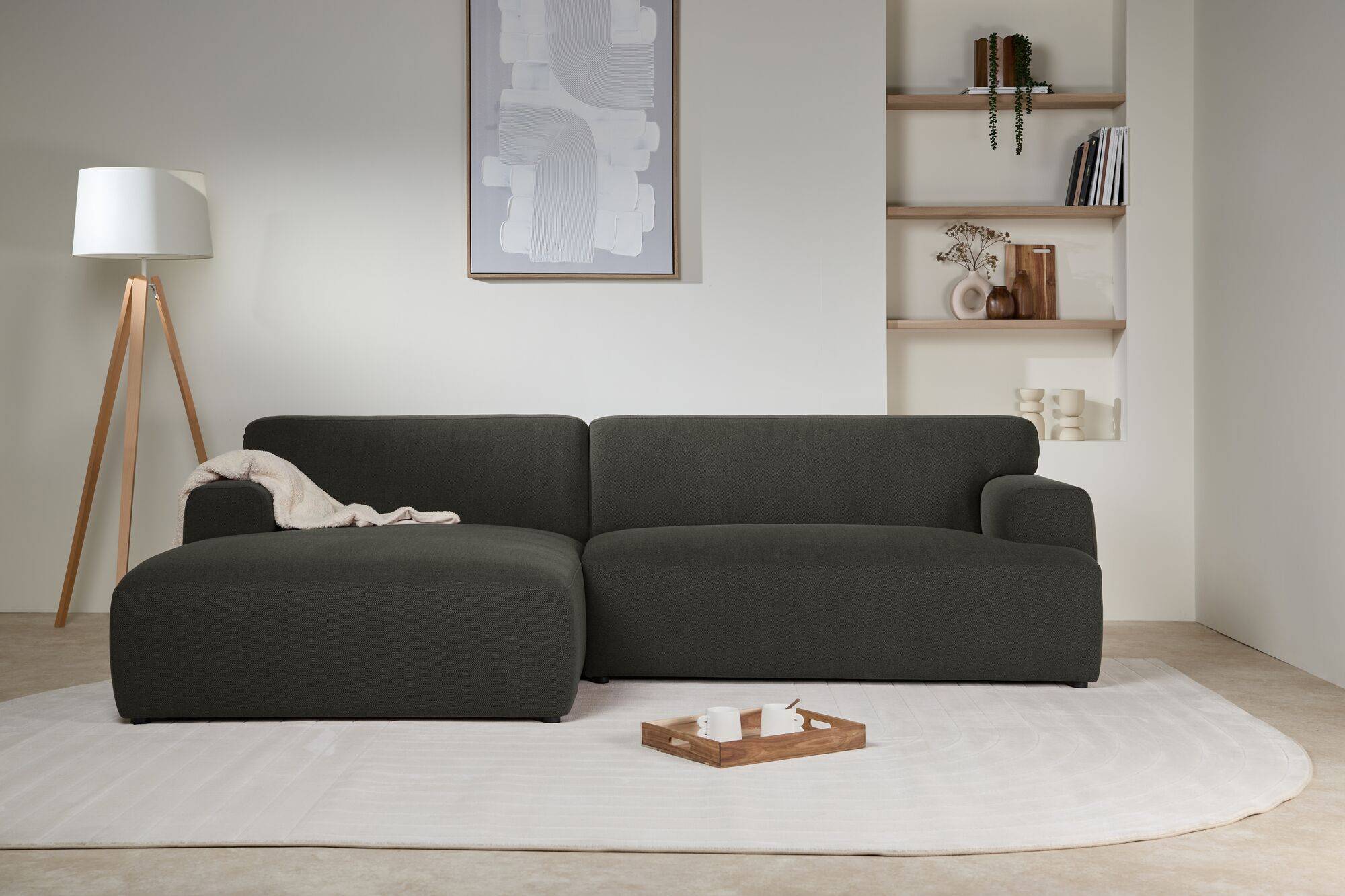Le canapé d'angle Pavel souligne à la fois le confort et le design moderne, tout en évoquant un côté cocooning et convivial grâce à ses grandes dimensions et ses formes arrondies.