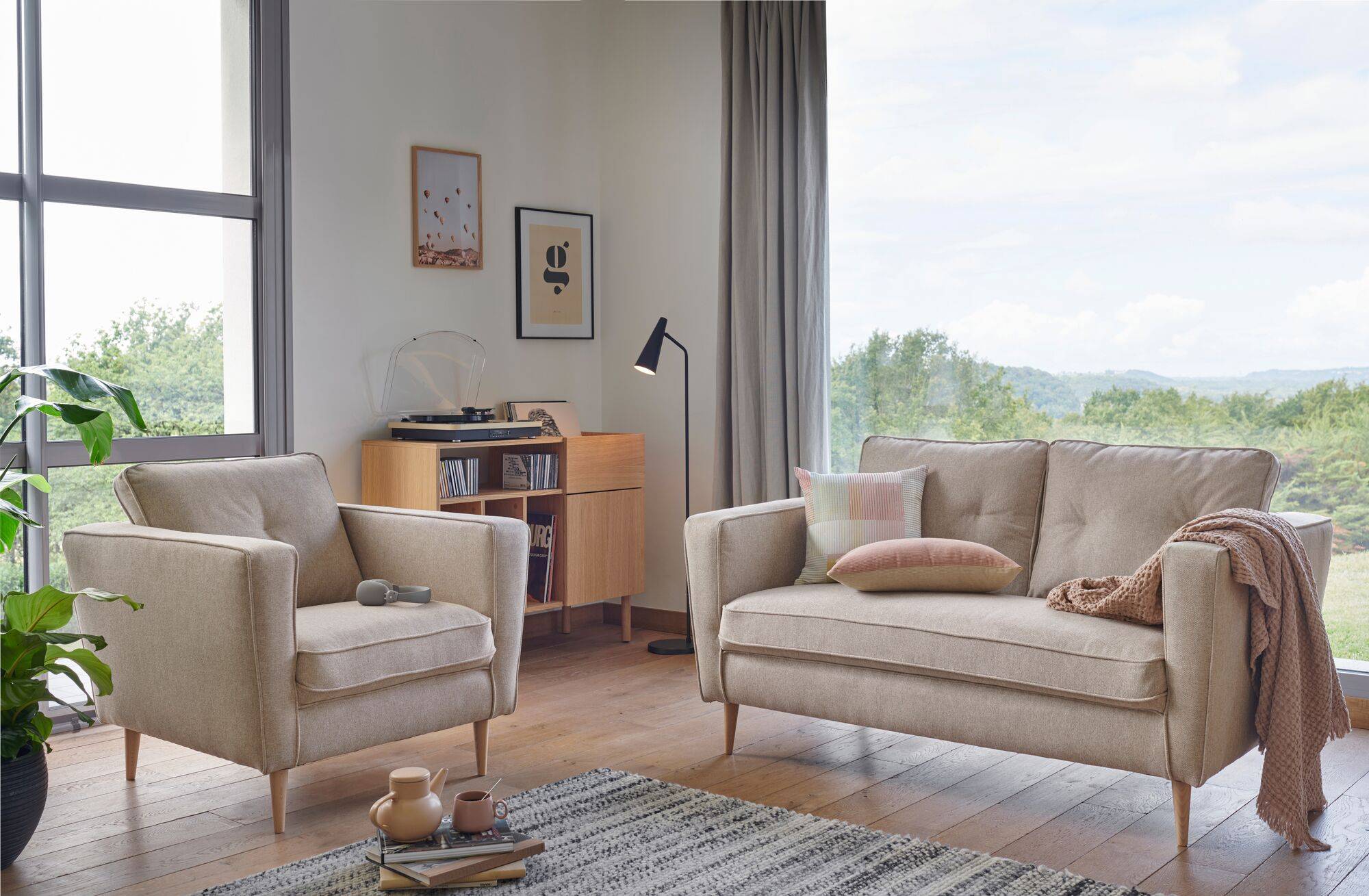 Le canapé Ondine, joliment perché ses ses pieds en bois, offre un style contemporain indéniable.