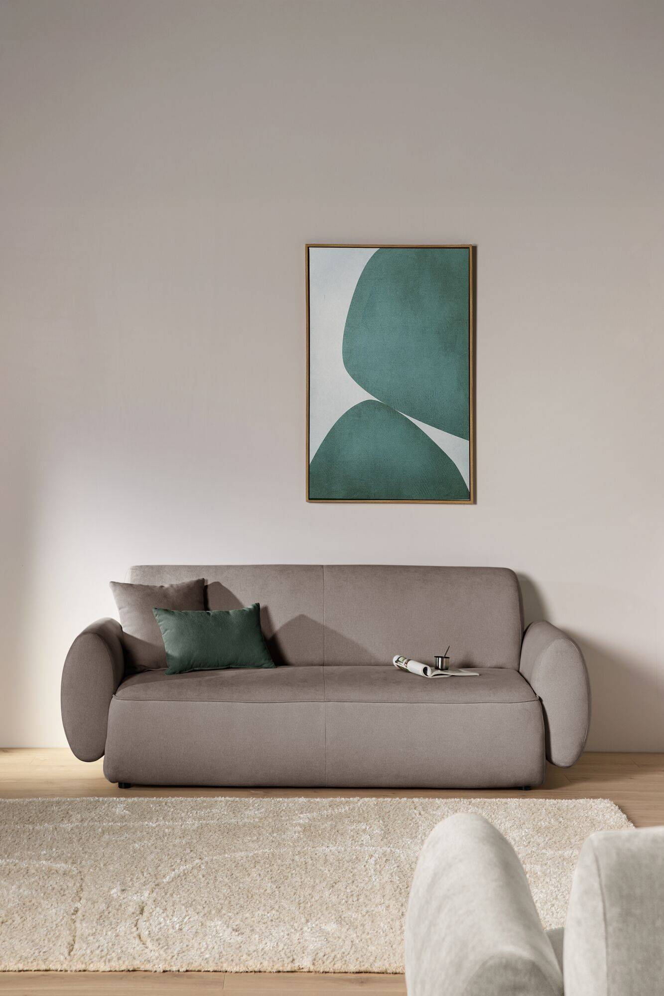 - Canapé taupe : 2 coussins carrés taupe + 1 coussin rectangle velours côtelé vert).
