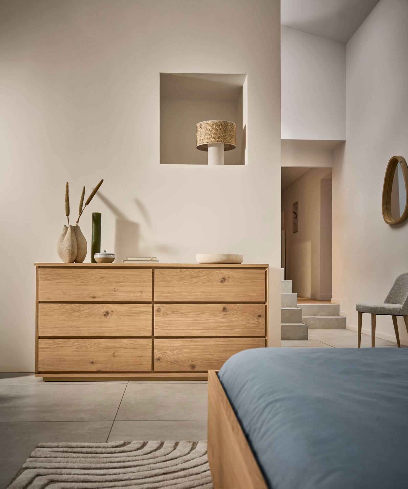 Apportez élégance et capacité de rangement à votre chambre avec la commode Albin 6 tiroirs. Son design épuré, souligné par un placage en chêne, crée une ambiance harmonieuse et structurée, idéale pour organiser votre espace avec style.