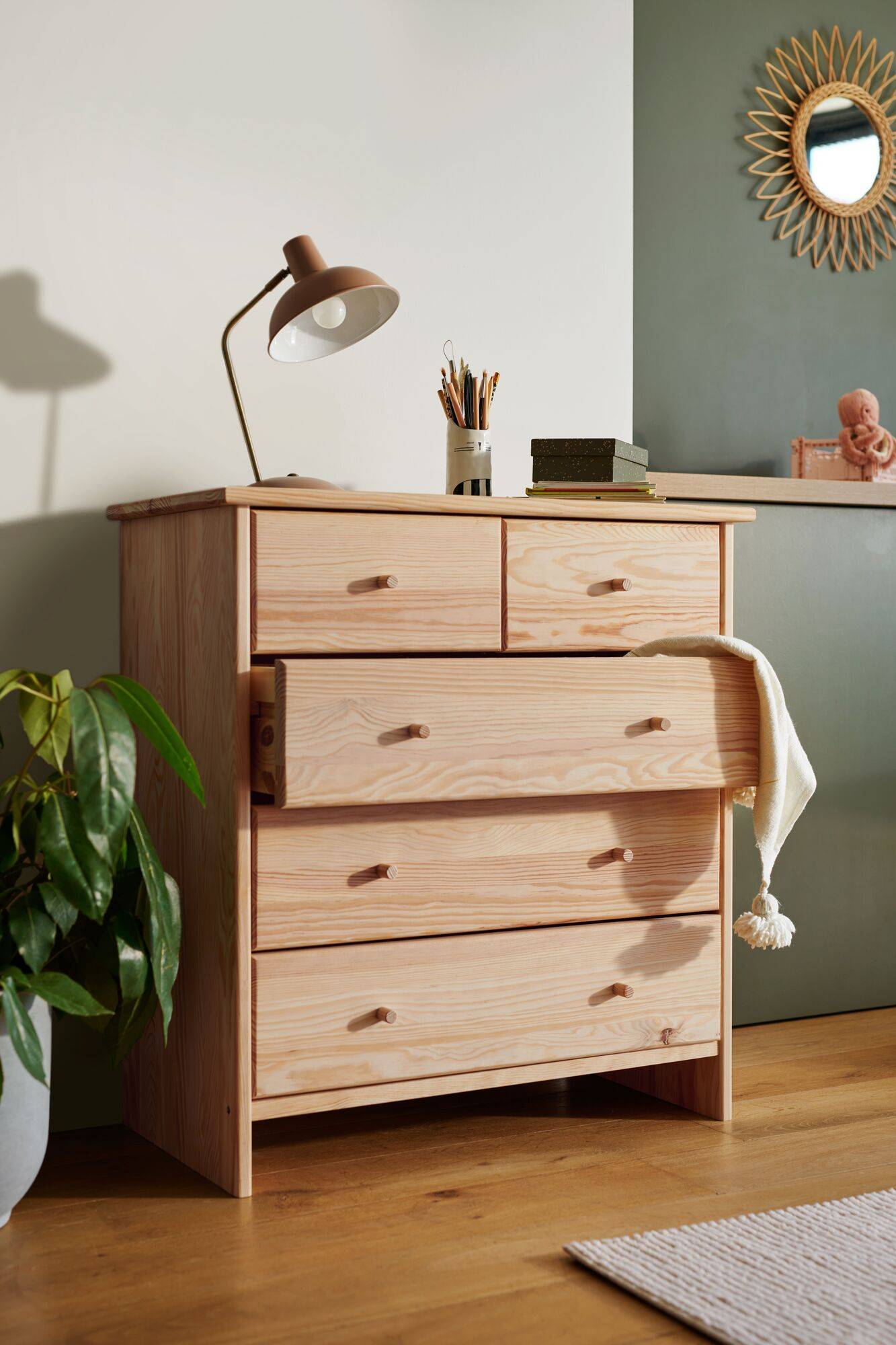 Fabriquée à partir de pin des Landes, la commode en bois massif Iris incarne la qualité et la durabilité, conçue pour vous accompagner à travers les années. Elle est dotée de trois larges tiroirs et de deux plus petits, la commode Iris offre un espace de rangement généreux pour organiser vos vêtements ou ceux de votre enfant. Pratique et esthétique, elle est idéale pour optimiser votre espace de rangement tout en ajoutant une touche de charme à votre intérieur grâce à son bois massif.