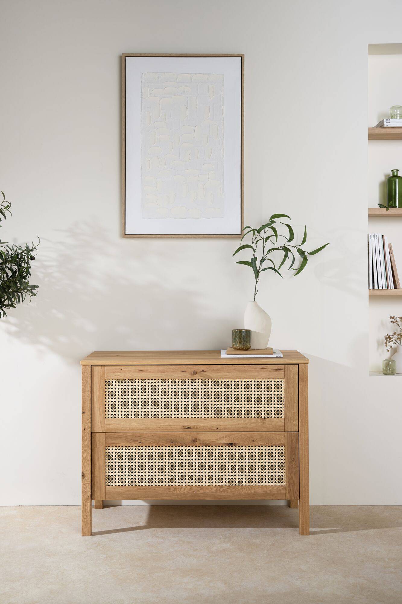 Fabriquée en chêne massif, elle assure une robustesse remarquable, conçue pour durer des générations. Le cannage finement tressé sur les tiroirs apporte une touche artisanale unique, tandis que les petits boutons en bois, sobres et élégants, servent de poignées délicates. Son design épuré et intemporel s'intègre harmonieusement à tous les styles de décoration, ajoutant une chaleur naturelle à votre espace.