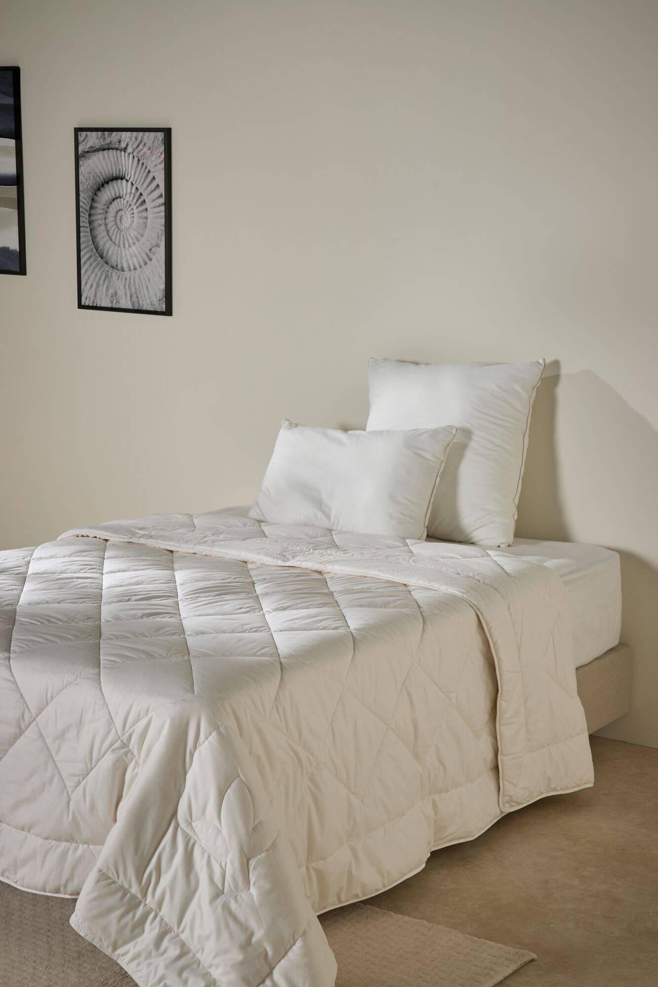Piquage carreaux, en diagonale, avec bourrelet sur tout le tour de la couette pour un parfait maintien du garnissage.