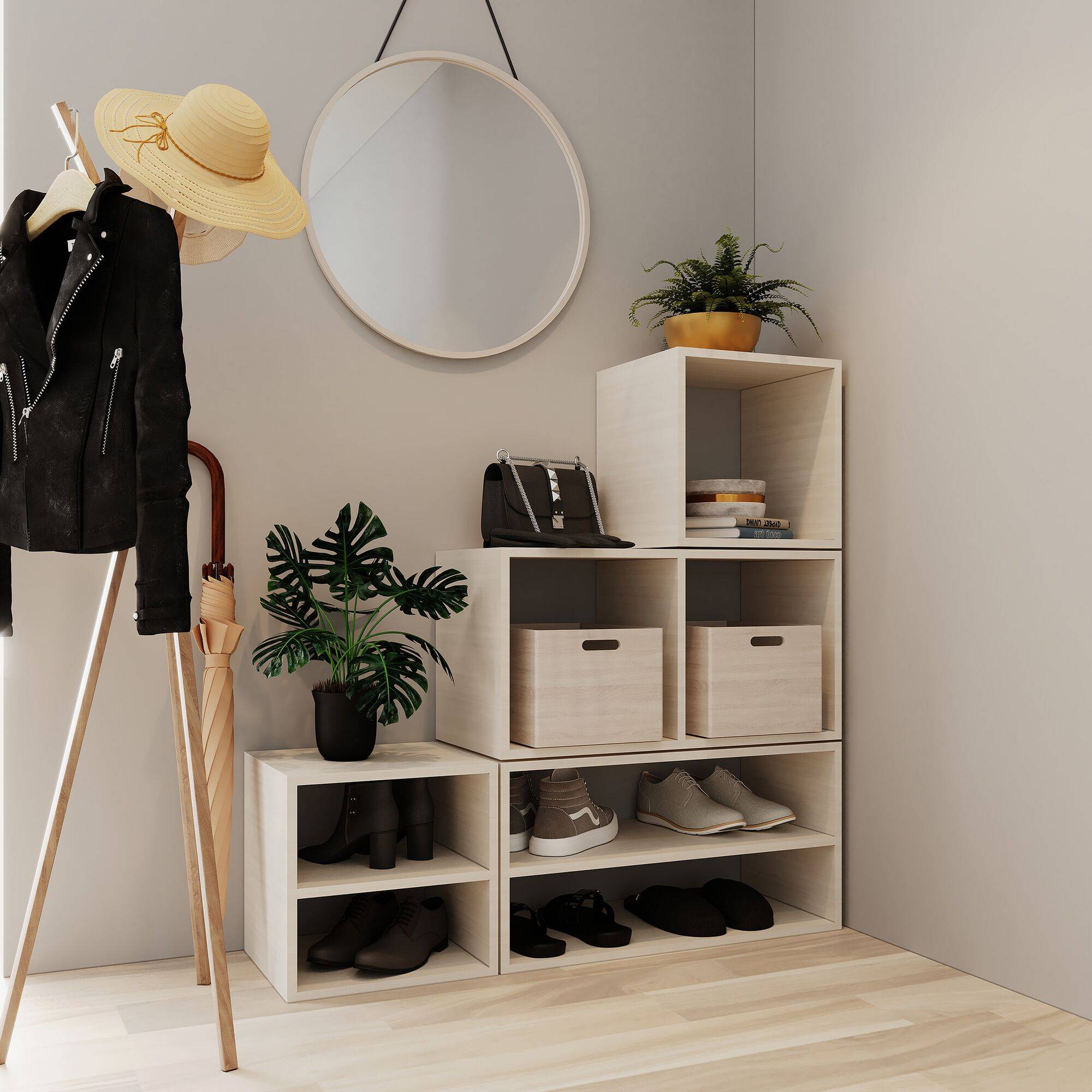 Elle se compose de 4 éléments de la collection Elio : 1 étagère 2 cases horizontales, 1 étagère 2 cases carrées, un cube et un cube avec étagère.