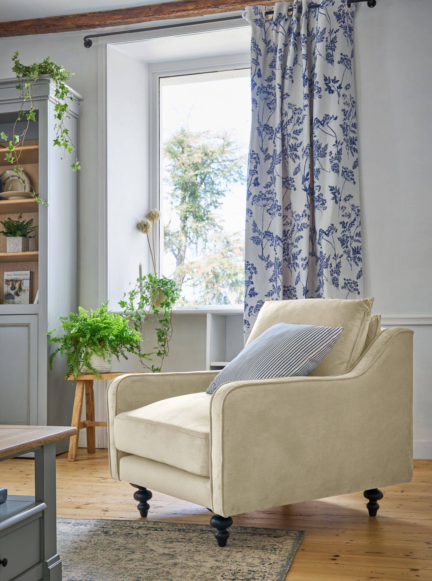 Le fauteuil velours Orso, sur ses pieds hauts et tournés, offre un caractère unique et raffiné.