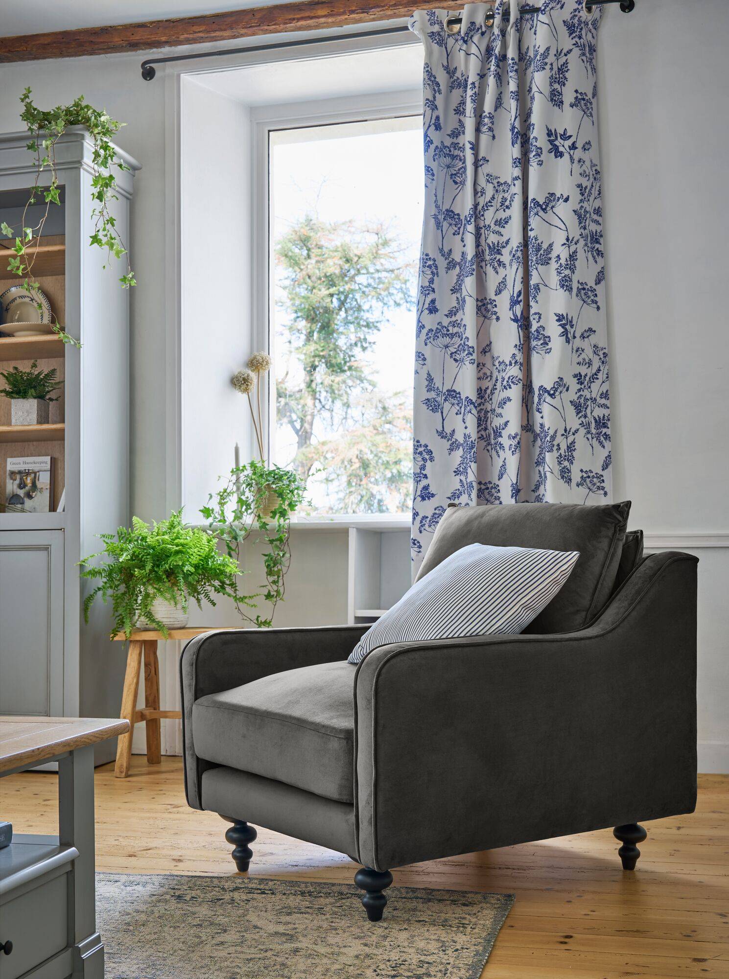 Le fauteuil velours Orso, sur ses pieds hauts et tournés, offre un caractère unique et raffiné.