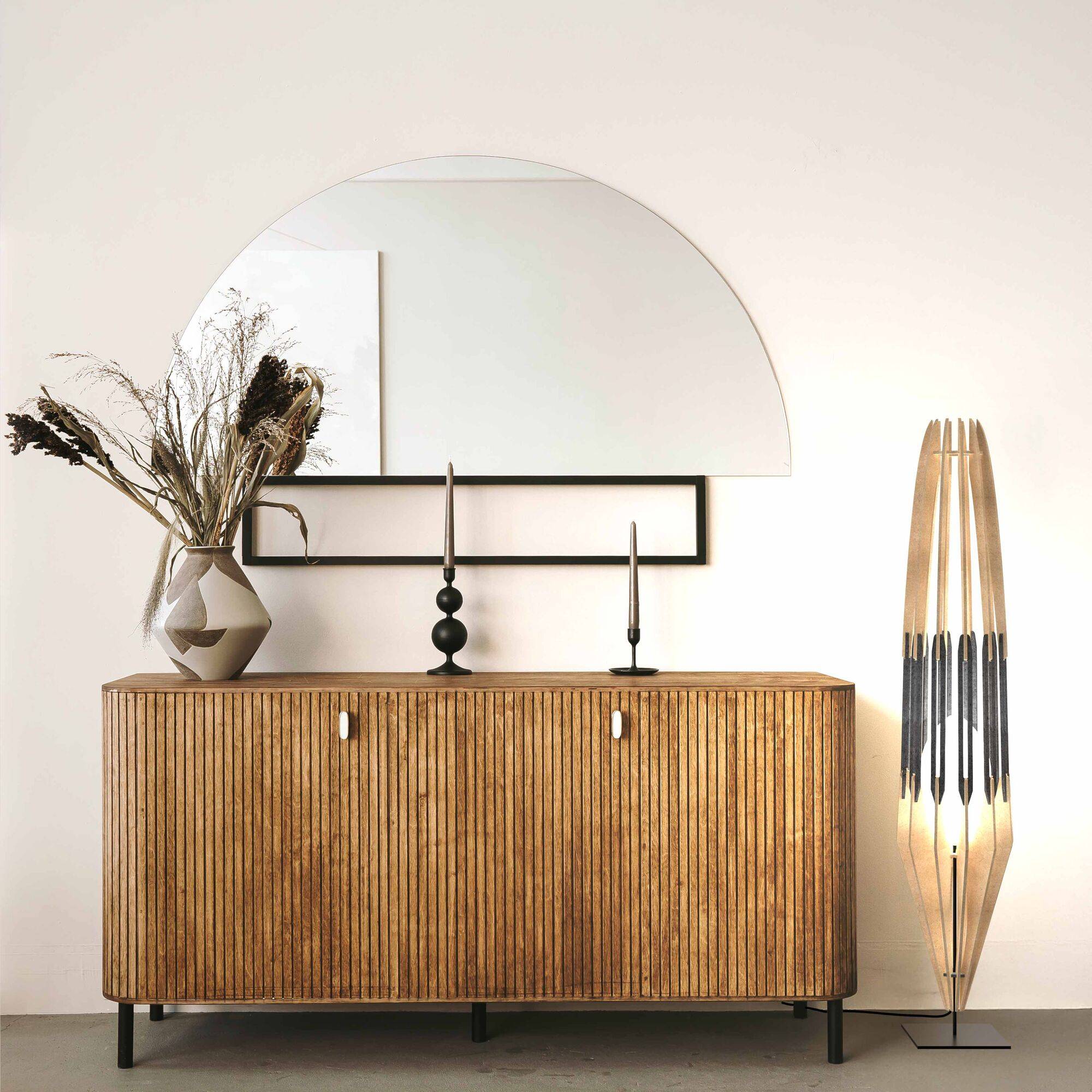 Le lampadaire FIRE possède une silhouette élancée et sculpturale évoquant à la fois la légèreté et la verticalité d’une flamme. Sa structure en bois encadre le cocon central et semble protéger un foyer.