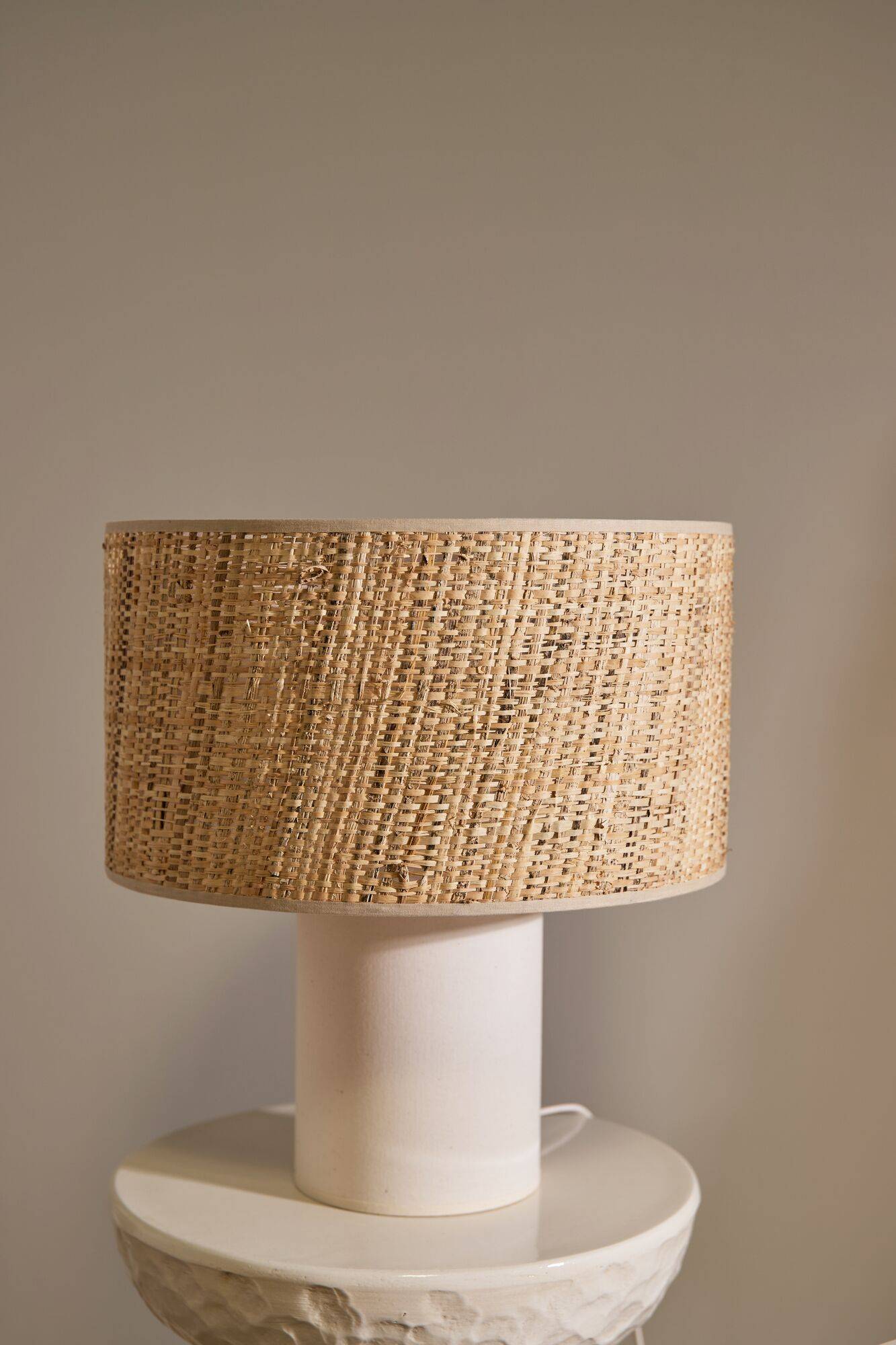 Son pied cylindrique est délicatement tressé en raphia blanc tressé, apportant une structure lumineuse et aérienne, tandis que son abat-jour en jute diffuse une lumière chaude et tamisée. C'est l'équilibre parfait entre l'élégance épurée et le charme rustique.