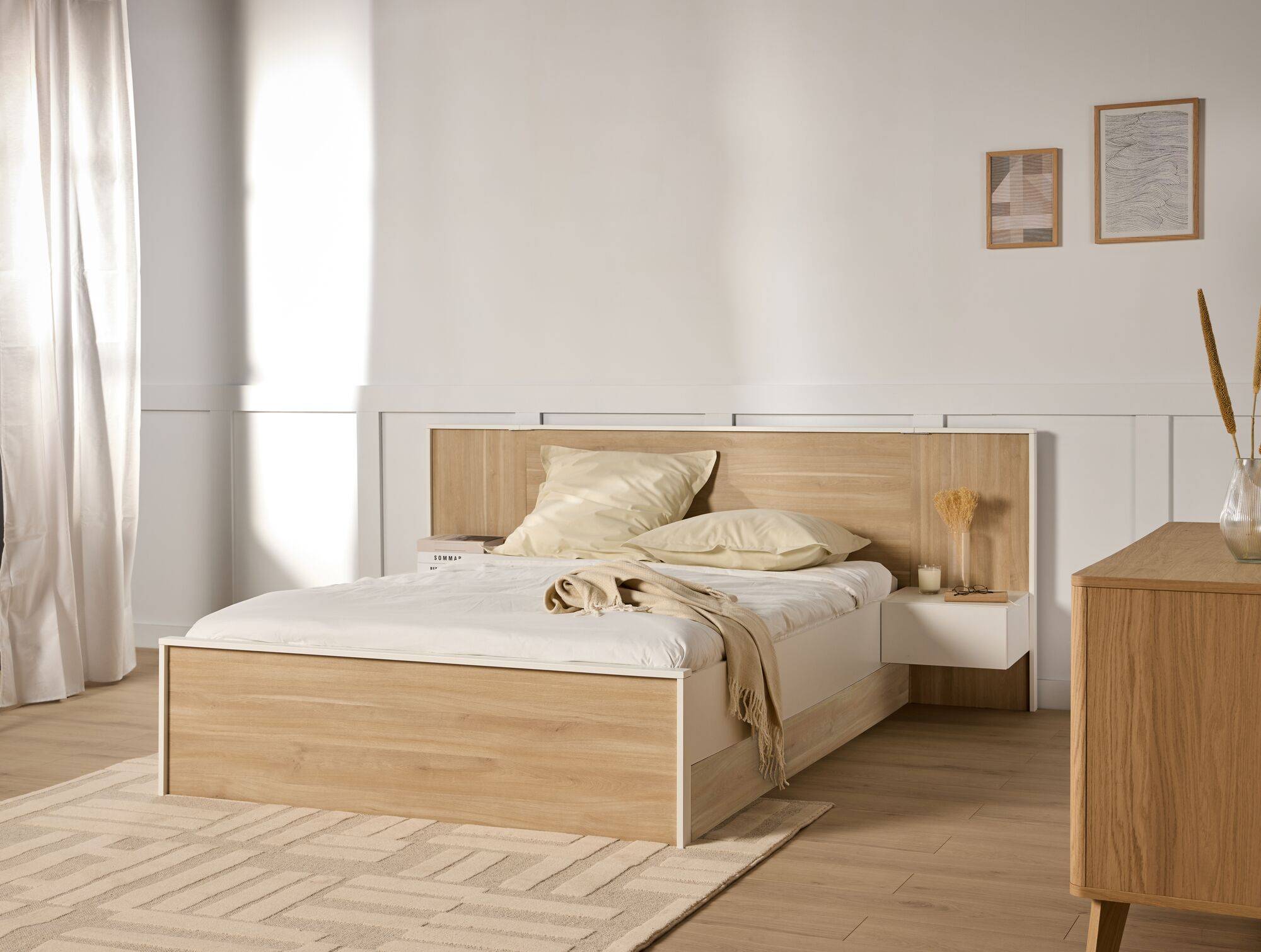 Son design moderne, associant un décor chêne et blanc, crée une atmosphère chaleureuse et contemporaine. Grâce à ses lignes épurées et son style soigné, il s’intègre harmonieusement dans tous les intérieurs, pour une chambre à la fois tendance et intemporelle.
