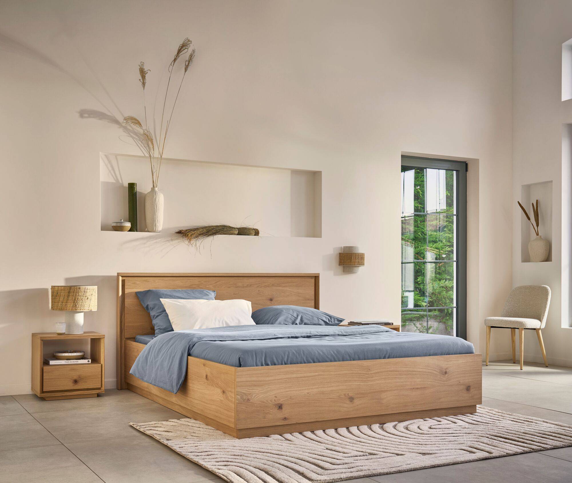 Apportez style et fonctionnalité à votre chambre avec le lit coffre Albin. Son design sobre et élégant, mis en valeur par un placage en chêne véritable, installe une ambiance chaleureuse et apaisante, parfaitement adaptée à un espace de repos moderne.