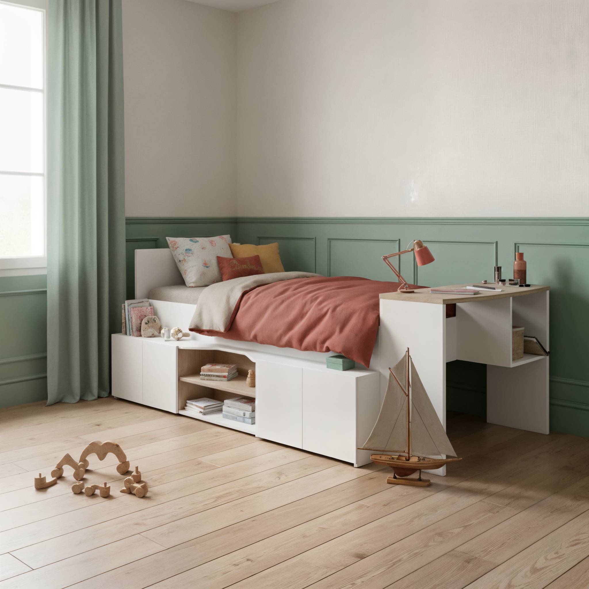 Aménager la chambre de son enfant quand on a un espace restreint est un véritable défi ! Grâce à ce lit enfant avec bureau intégré Pietro, vous maximisez chaque mètre carré et créez un espace nuit plus épuré et apaisant. C’est le choix parfait pour une petite chambre d’enfant.