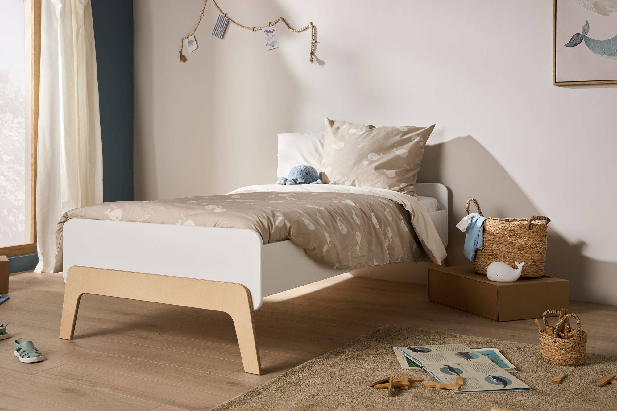 Avec ses finitions mêlant blanc et bois clair, ce lit évolutif s’intègre harmonieusement dans toutes les chambres d’enfants. Ses lignes épurées et ses pieds soigneusement dessinés en font un meuble à la fois fonctionnel et esthétique, apportant une touche de douceur à l’espace.