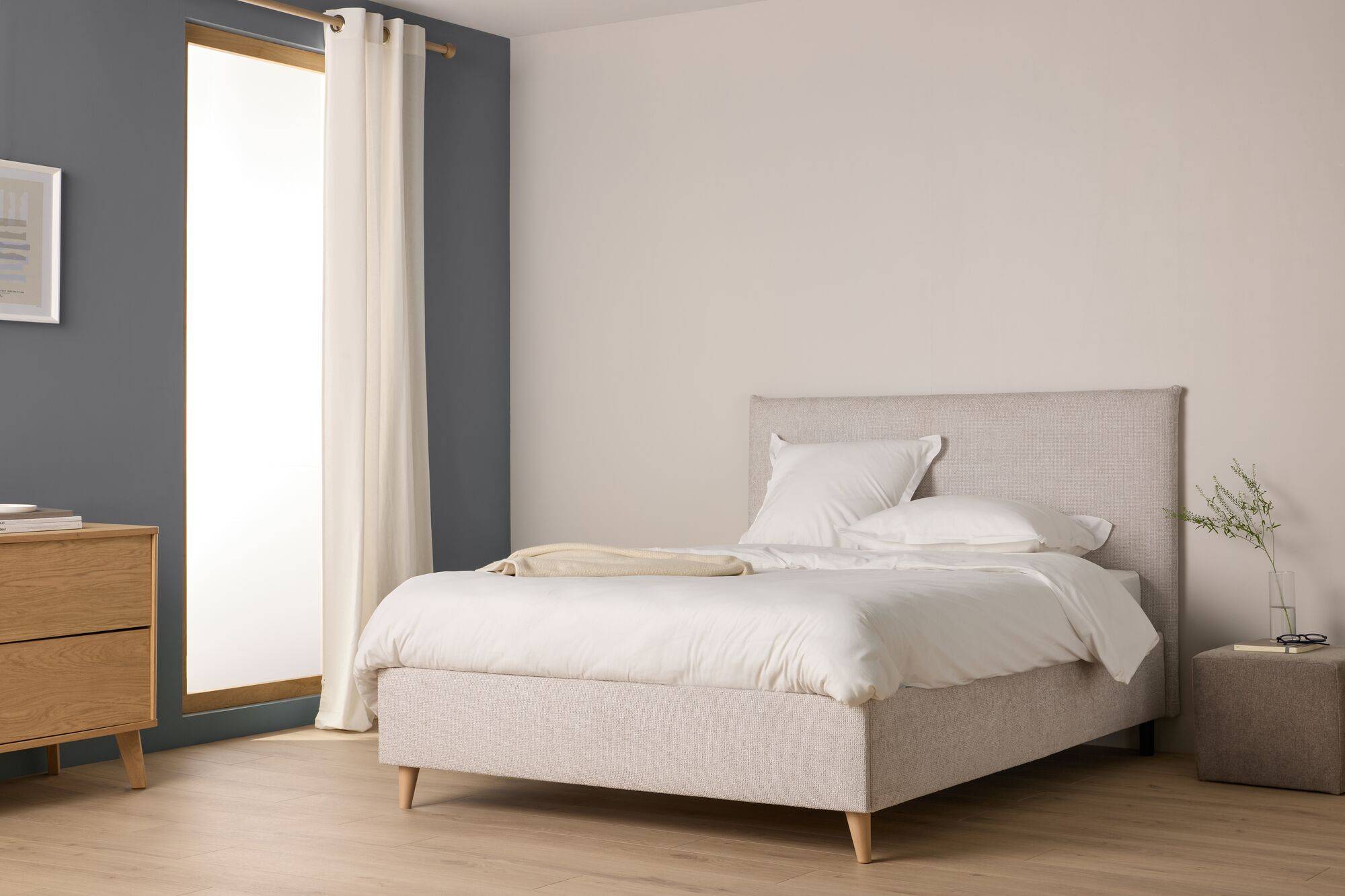 L’esthétique du lit Paulin repose sur l’harmonie des textures et des formes. Habillé d’un tissu texturé au grain délicat, il apporte une luminosité apaisante à votre pièce. Sa tête de lit généreusement rembourrée n’est pas seulement un élément décoratif : elle a été pensée comme un dossier confortable pour vos moments de lecture ou de repos. L’ensemble est soutenu par des pieds en bois massif aux lignes fuselées sur le devant, garantissant une stabilité parfaite et une allure aérienne.