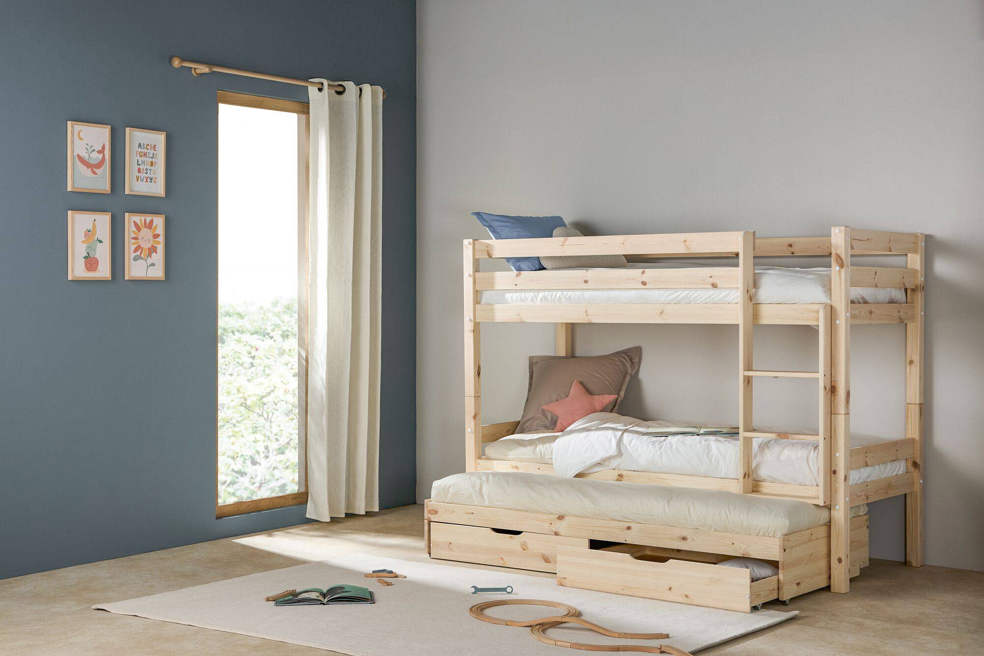 Fabriqués en bois massif, ils offrent robustesse et longévité tout en s’adaptant à tous les styles de décoration. Leur conception ingénieuse permet de transformer les lits superposés en deux lits indépendants, et intègre également un lit gigogne, parfait pour accueillir un invité ou offrir plus de confort au quotidien.