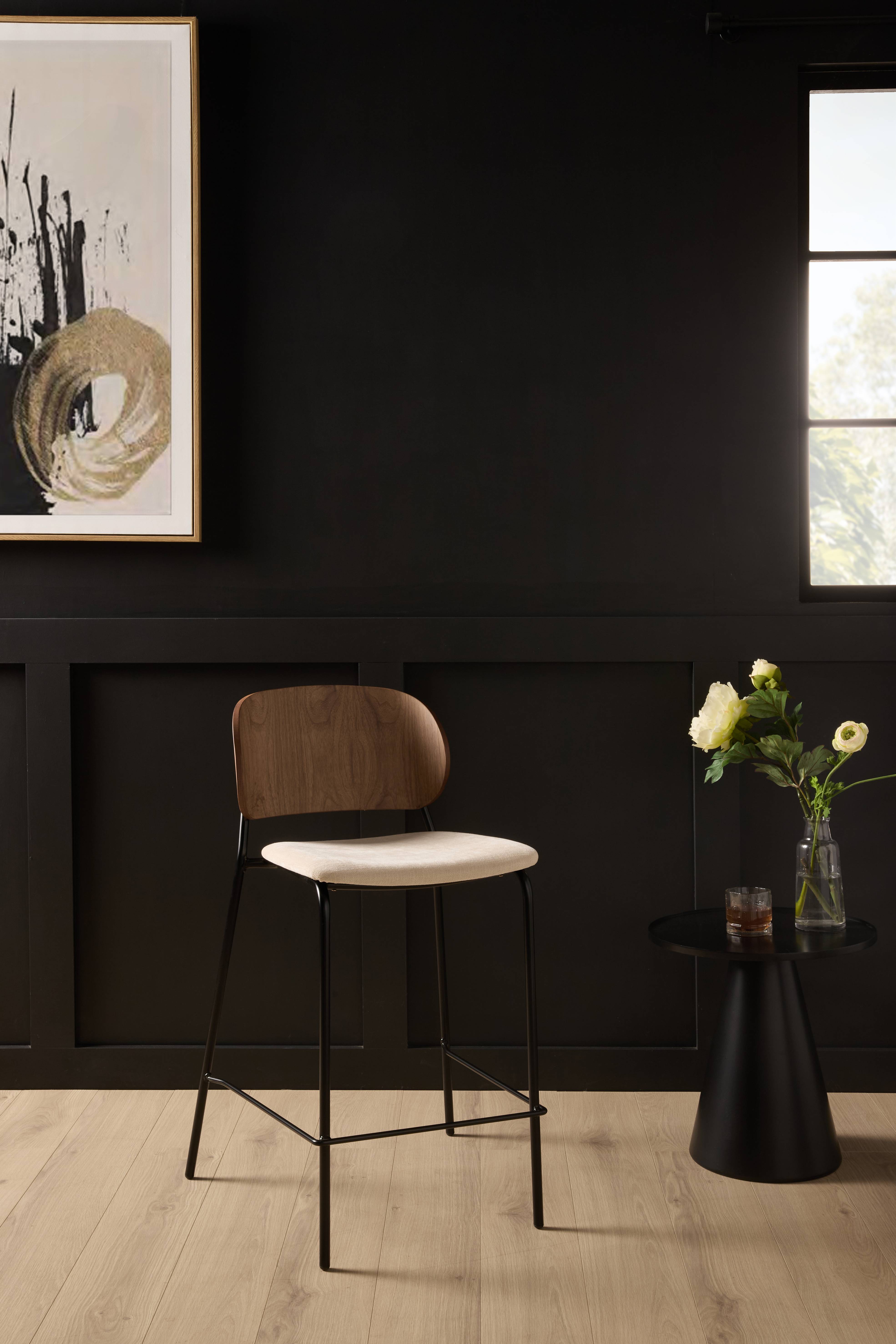 Confortables au quotidien, ces chaises offrent une assise large et agréable, soutenue par un piètement en métal noir qui assure stabilité. Le repose-pieds intégré renforce le confort, permettant de profiter pleinement de chaque instant, du café du matin aux soirées conviviales. Le dossier, proposé en placage chêne, placage noyer ou en finition tissu, apporte une note raffinée qui enrichit subtilement leur design.
