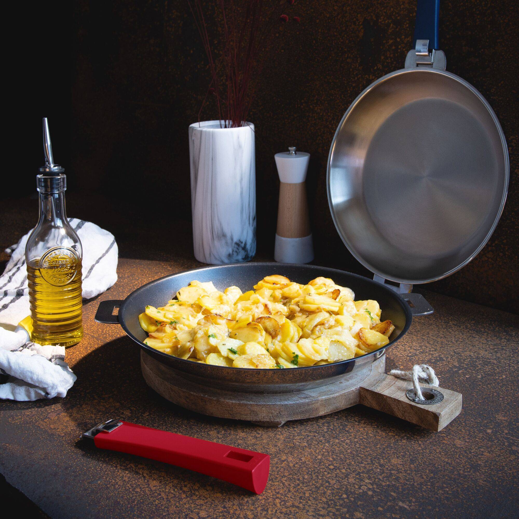 Le concept amovible de Cristel est unique, la poignée se fixe et s'enlève avec facilité et sécurité. Les articles s'emboîtent totalement et ne prennent pas de place, ni dans les placards, ni dans le lave-vaisselle, ni sur la table de cuisson.