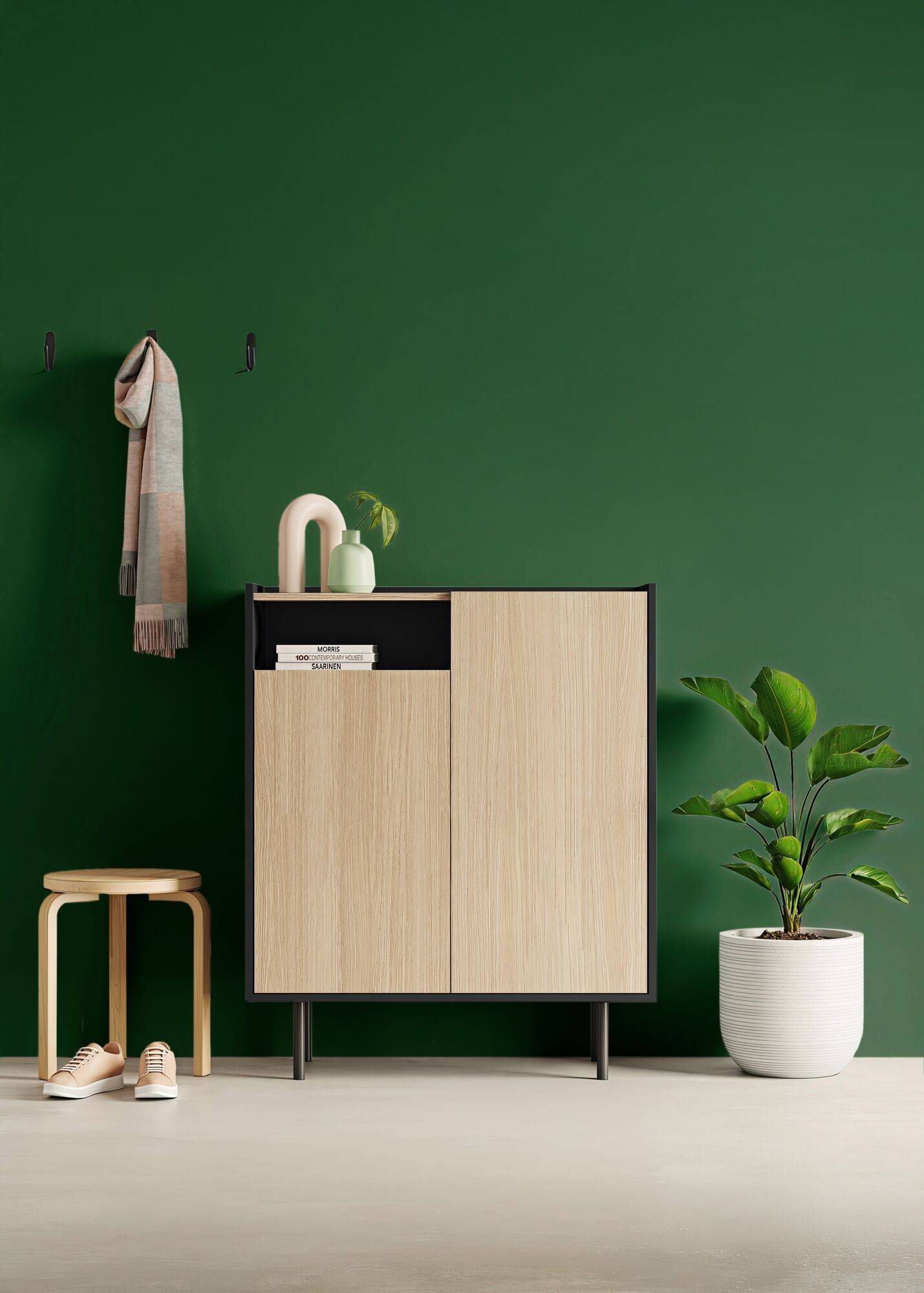 Derrière ses deux portes se cachent des tablettes qui peuvent être placées à l'horizontal, ou bien en biais pour optimiser l'espace pour le rangement des chaussures. Il est également doté d'une niche sur sa partie supérieure. Avec son association de bois et de noir, c'est un meuble qui s'intègre très bien dans les intérieurs contemporains.