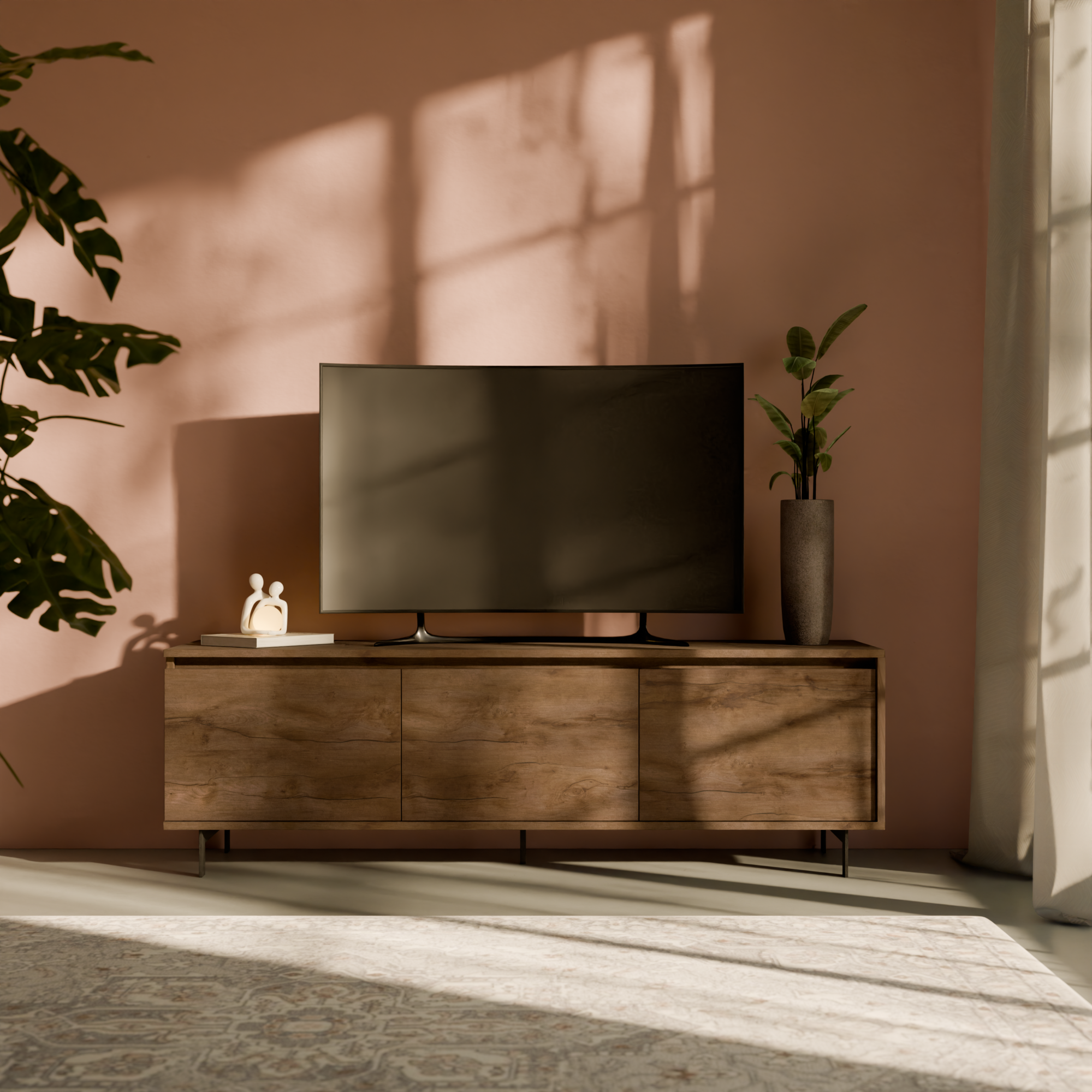 Avec ses pieds en métal noir et son décor bois, le meuble TV Gustavo s'intègre harmonieusement dans tous les styles d’intérieur, du plus moderne au plus chaleureux. Ses trois portes dissimulent de vastes espaces de rangement, idéaux pour organiser vos équipements multimédias, accessoires et objets déco, tout en préservant l’ordre dans votre pièce.