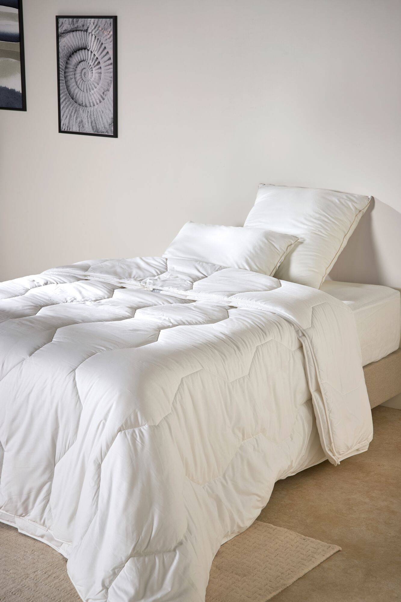 Son garnissage est composé de flocons 100 % polyester siliconé creux et son enveloppe en 100% coton traité anti-acariens.