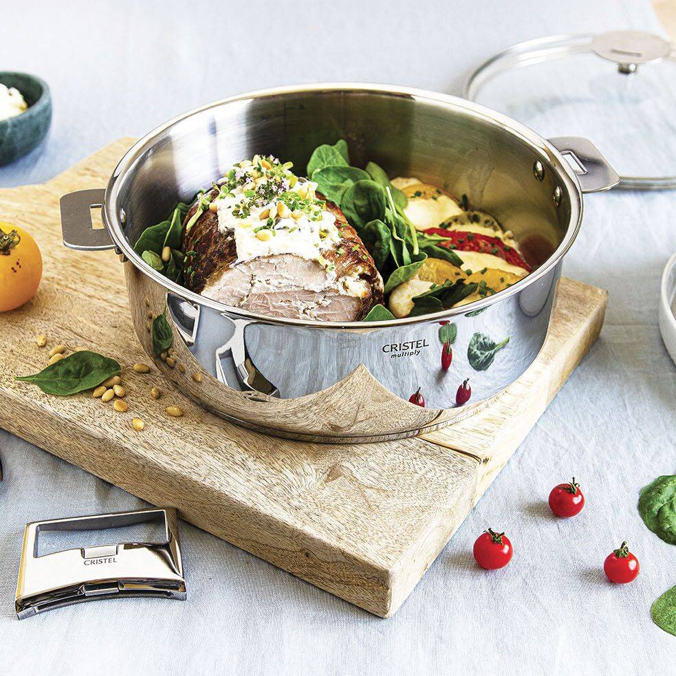 Emblème du concept « Cuisson-Service », la sauteuse inox passe de la cuisine à la table et se transforme en plat de service en se parant de 2 anses (non fournies).