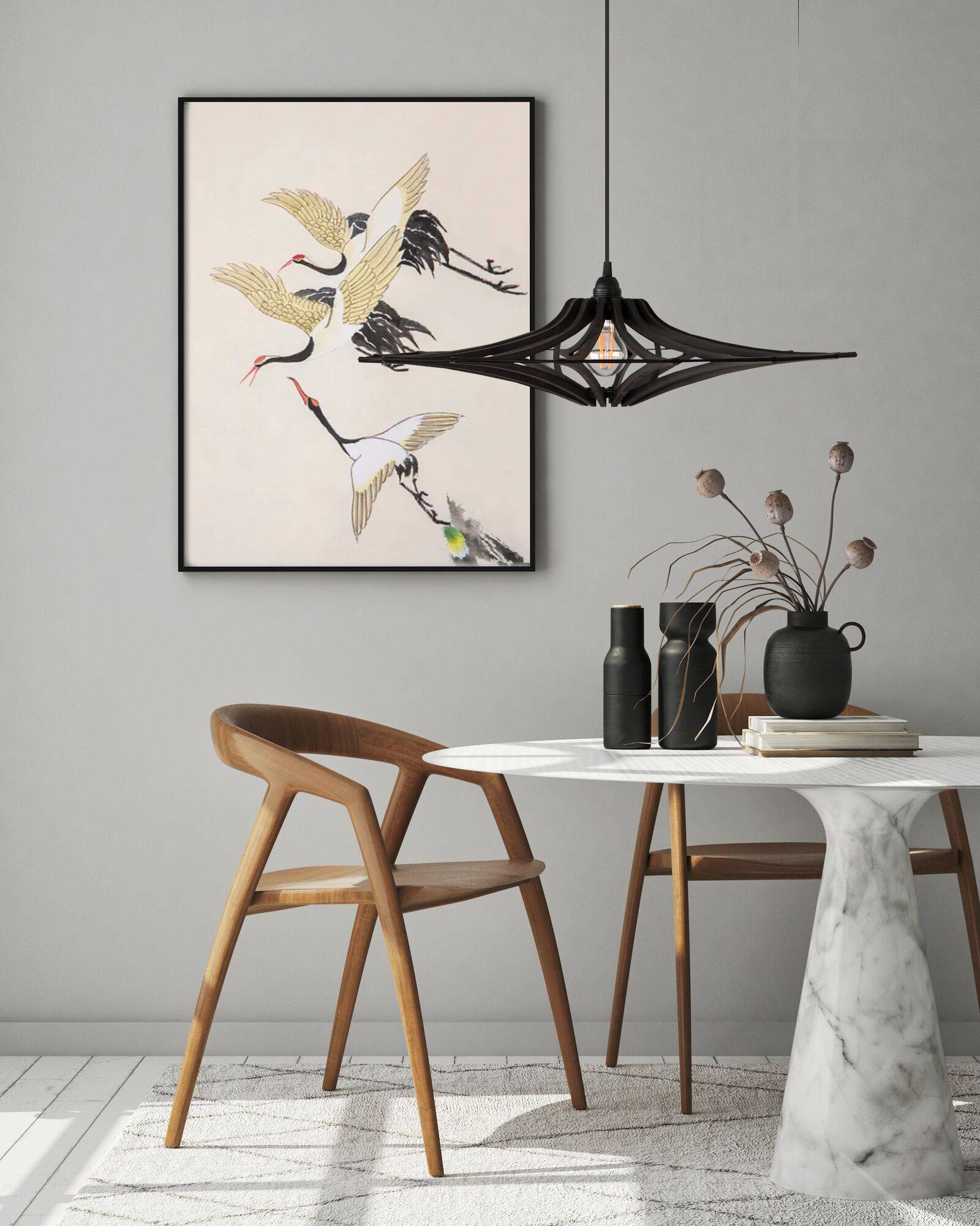 Idéale quelle que soit votre hauteur sous plafond. Sa forme et sa couleur teintée masse en font un objet résolument design pour votre intérieur sans sacrifier l'environnement. Sa finition en bois noir mat assure une présence à la fois graphique et sophistiquée. Elle s’impose sans dominer et structure l’espace en y ajoutant une touche d’élégance sensible. Idéale pour un intérieur qui cherche à marier esthétisme épuré et émotion artistique.