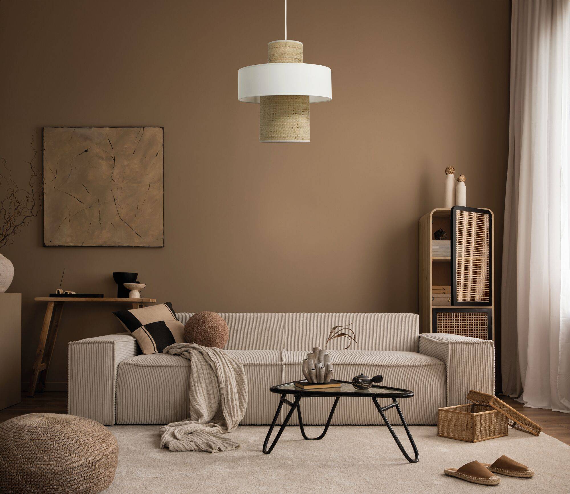 Ce luminaire d'exception captive par la rencontre entre la chaleur de la jute et la douceur épurée du lin blanc, créant un équilibre visuel d'une rare élégance. L'intérêt de cette pièce réside dans son design à deux niveaux, où la partie centrale en jute tissée traverse un large anneau de lin blanc, offrant une structure graphique qui rythme votre intérieur avec légèreté. Imaginez cette suspension trônant dans votre salon ou au-dessus d'une table en bois clair, où elle diffuse une lumière chaleureuse et filtrée qui invite instantanément à la sérénité et au bien-être.