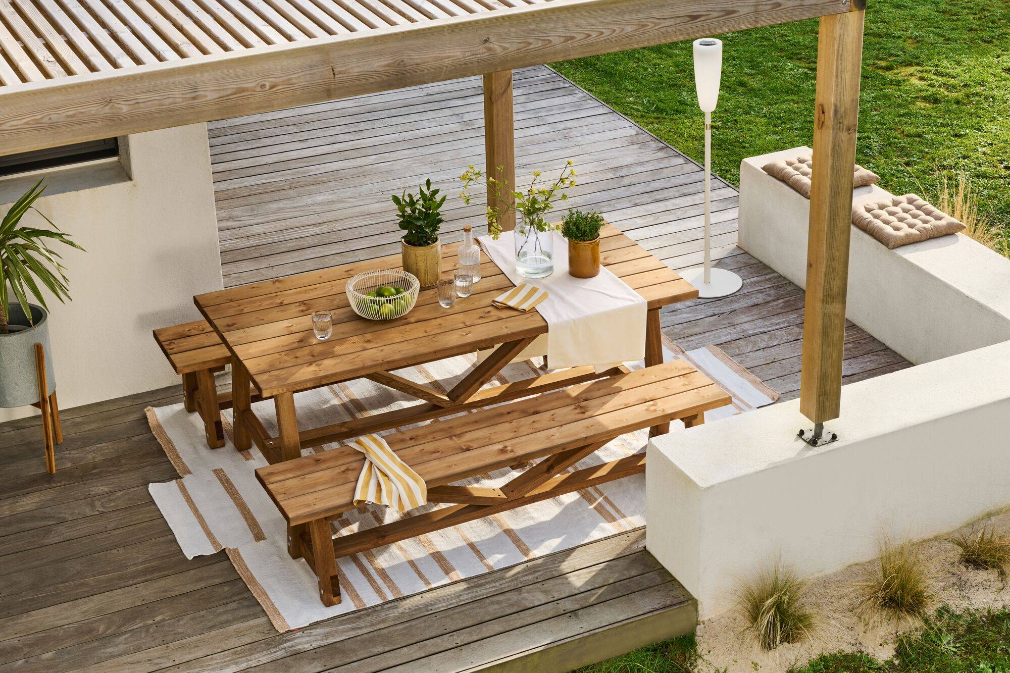 Vous recherchez une table de jardin robuste et assez grande pour vos déjeuners dehors en famille ? Découvrez l'ensemble table avec deux bancs en bois massif Edwina.
