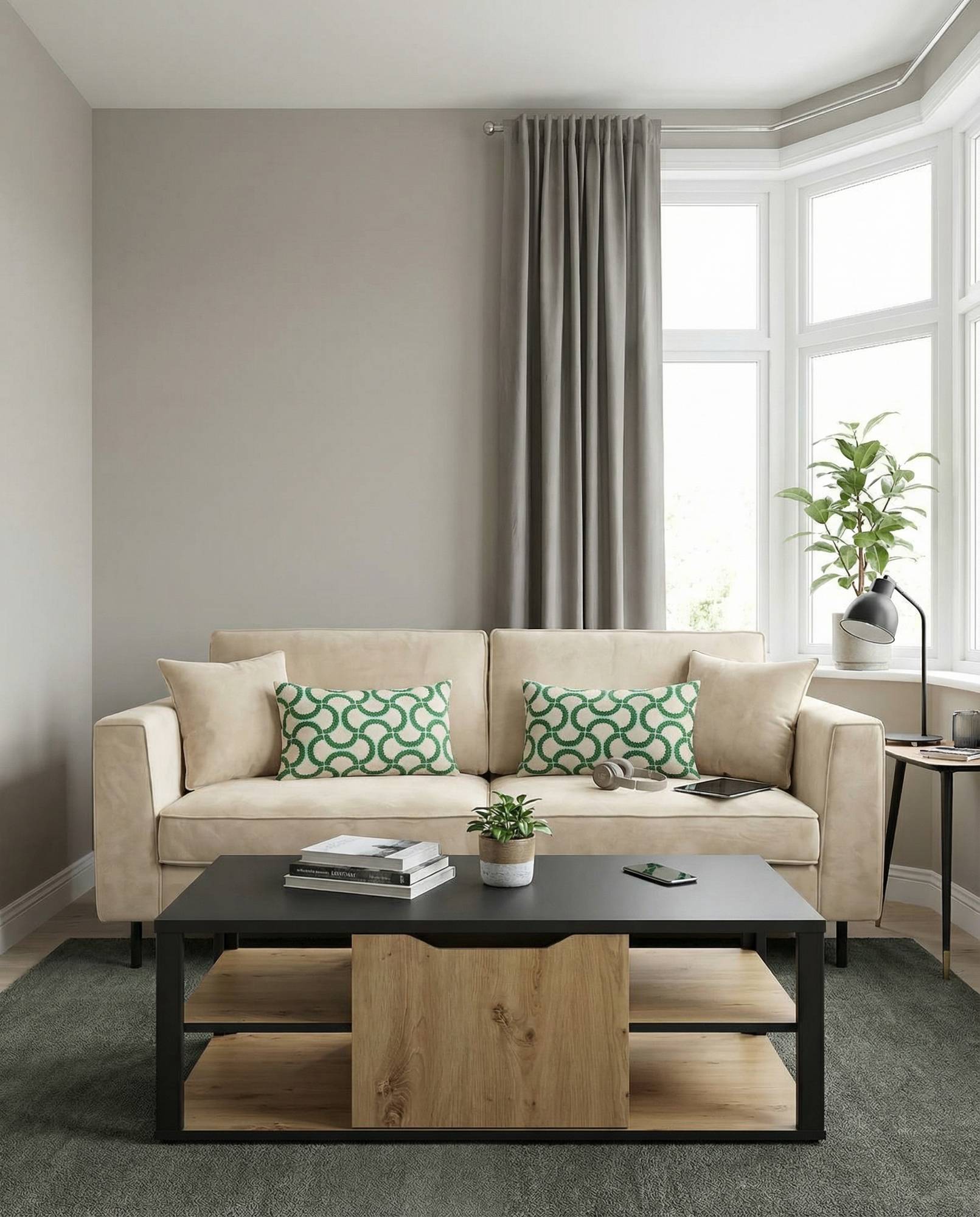 La table basse Georgie, pratique et conviviale, s’inscrit dans un style contemporain, avec l’association de la finition bois clair et noir. Elle présente des tablettes de part et d'autre, idéales pour ranger des magazines, livres ou autres télécommandes. Au centre, on trouve un grand coffre de rangement, accessible par une porte latérale qui permet de ranger tous les objets que vous souhaitez avoir à portée de main, sans qu'ils soient visibles.