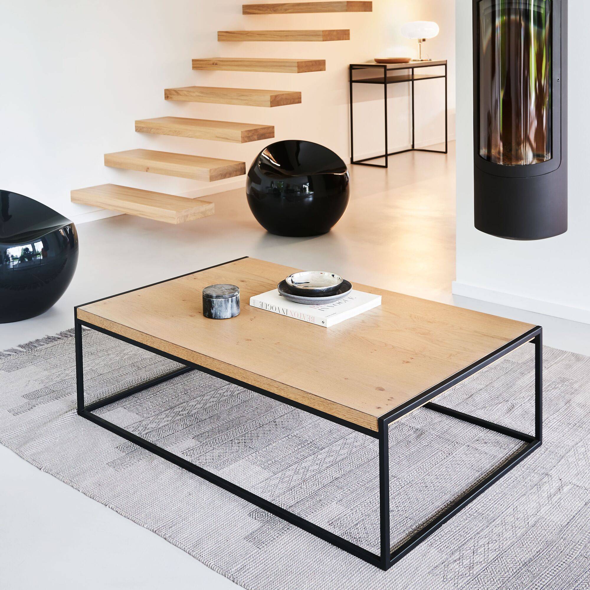La Table basse Maddie est une table basse sobre et élégante. Elle se compose d’un plateau en panneau MDF plaqué chêne naturel à nœuds et d’un piètement en acier laqué noir mat.