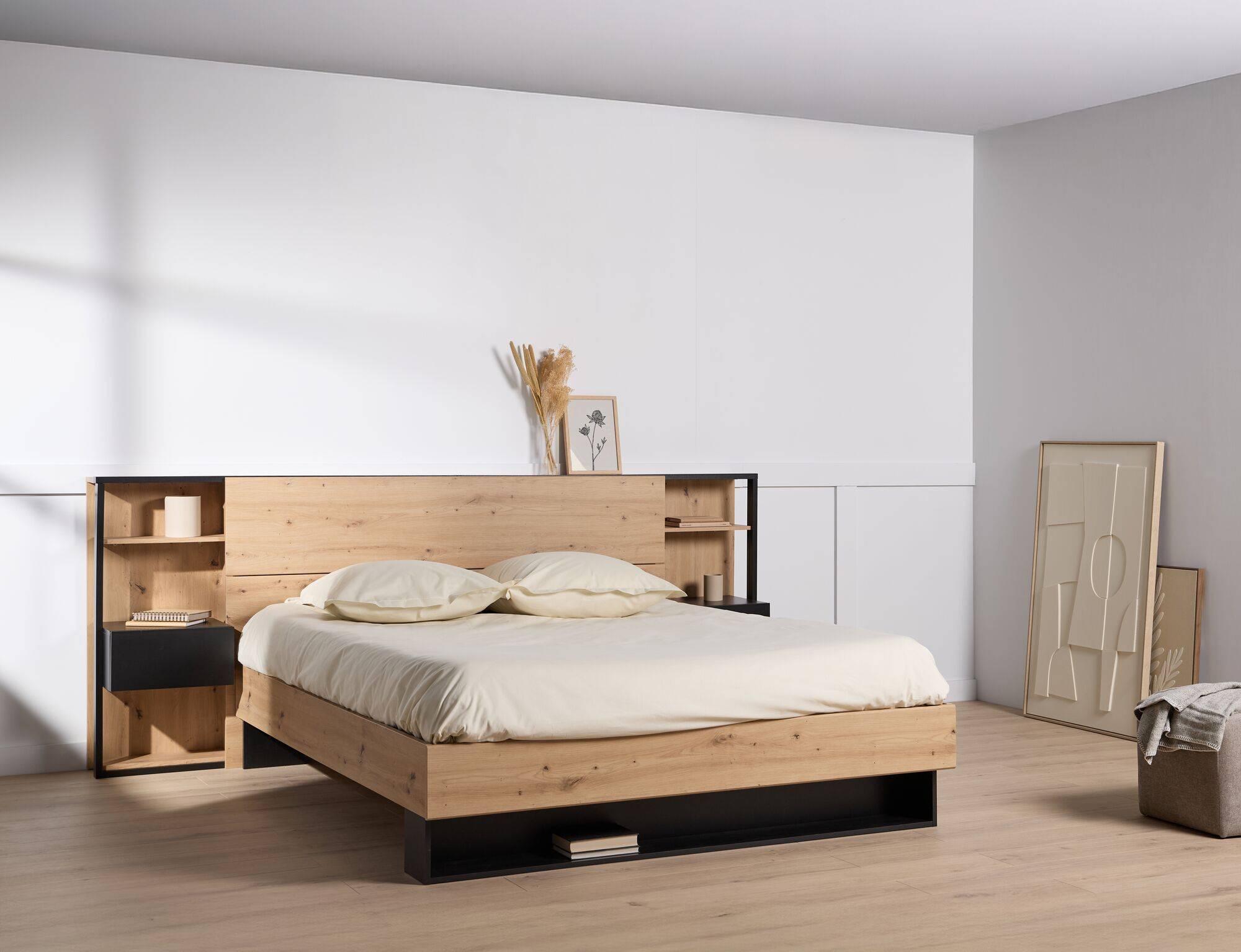 Véritable centre de commande de votre espace repos, ce meuble ne se contente pas de décorer. Il intègre de chaque côté un tiroir-chevet suspendu et de multiples niches ouvertes pour garder à portée de main vos objets essentiels : livres, lunettes ou smartphones. Sa tablette supérieure offre une surface idéale pour personnaliser votre décoration avec des cadres, des vases ou des plantes, sans avoir à percer vos murs.